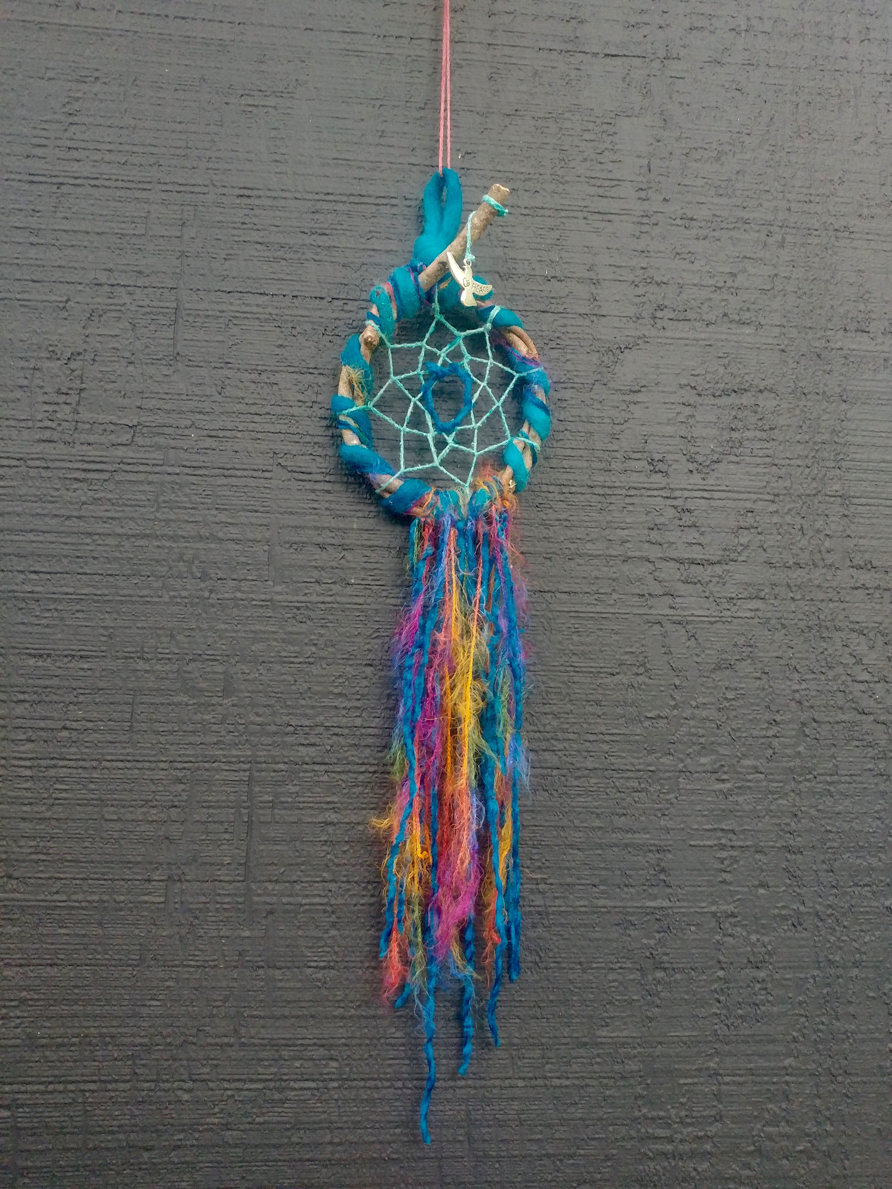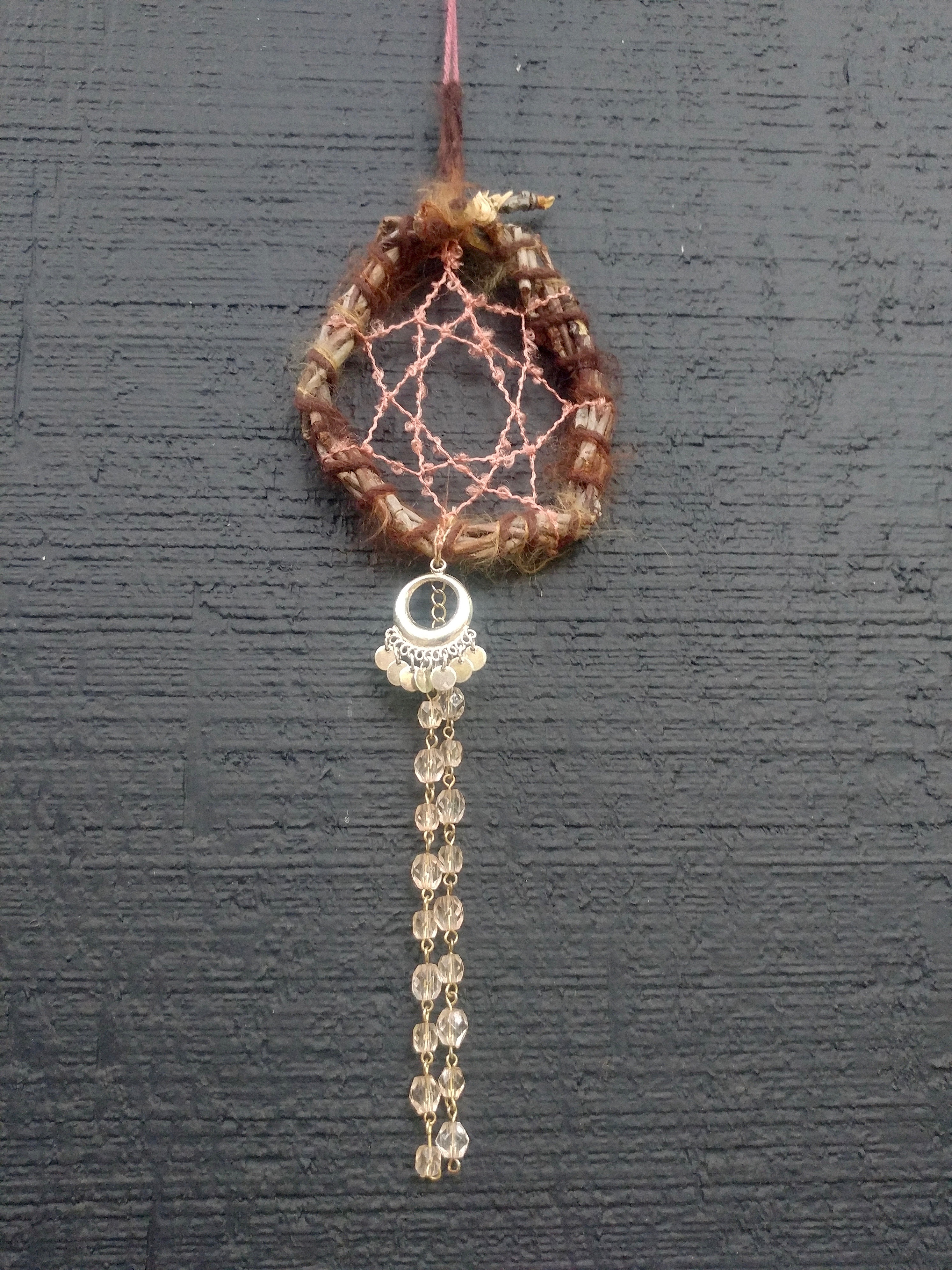 When I made this catcher I pulled "The Chariot" From my tarot deck. The Chariot is all about willfulness, determination and travel. Moving forward and onward having made your peace with both the dark and the light and resting in the space between them both.